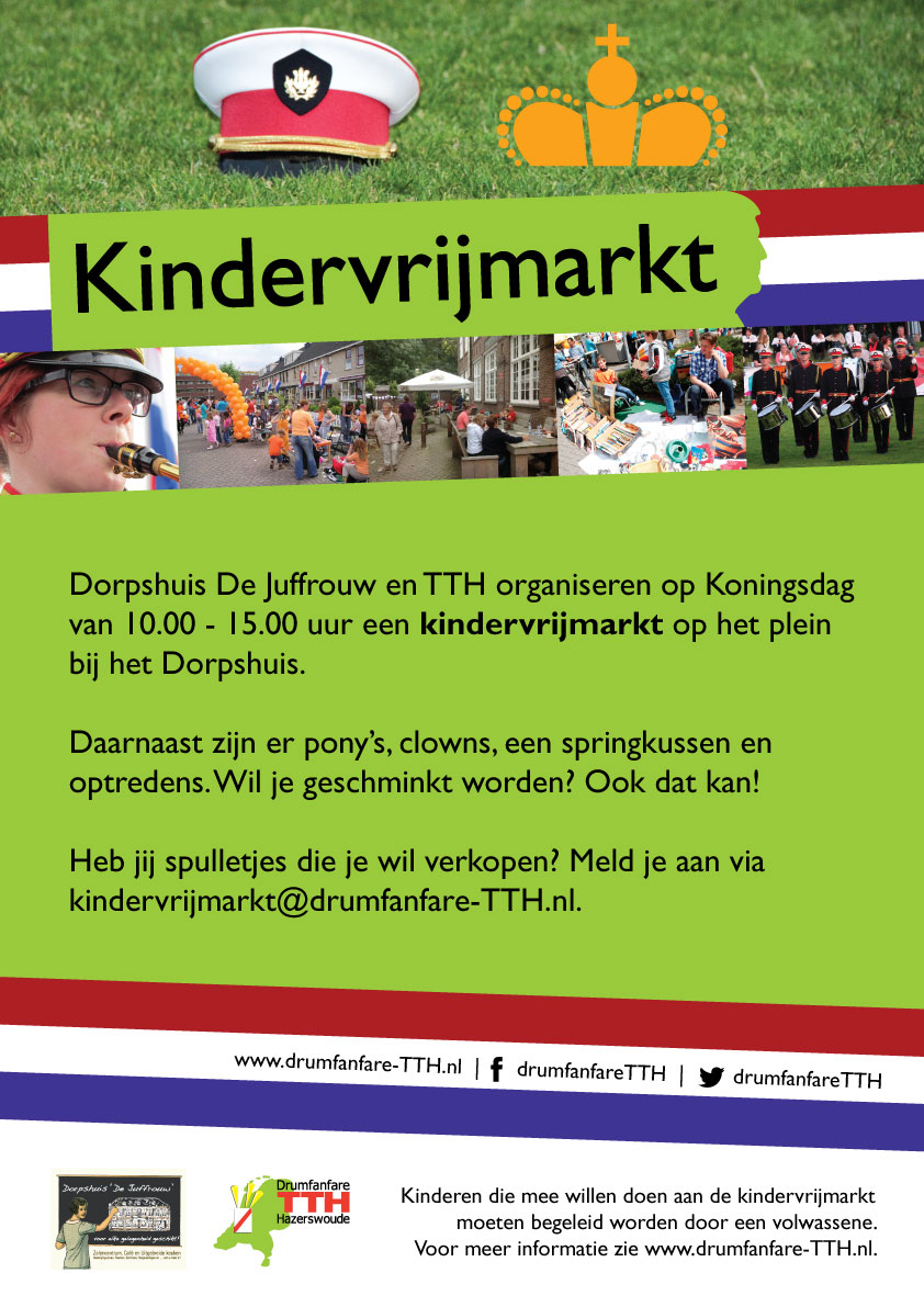Drumfanfare TTH en Dorpshuis De Juffrouw hebben de handen ineengeslagen om op Koningsdag iets nieuws te brengen. Op het plein voor het Dorpshuis vindt de 1e Kindervrijmarkt van Hazerswoude-Dorp plaats! Kinderen van 4-12 jaar kunnen tussen 10.00 uur en 15.00 uur onder begeleiding van een volwassene hun oude spulletjes en speelgoed verkopen. Schuilt er misschien een topverkoper in jou? Meld je dan snel aan op kindervrijmarkt@drumfanfare-tth.nl. Naast de Kindervrijmarkt is er nog veel meer te doen op het plein!