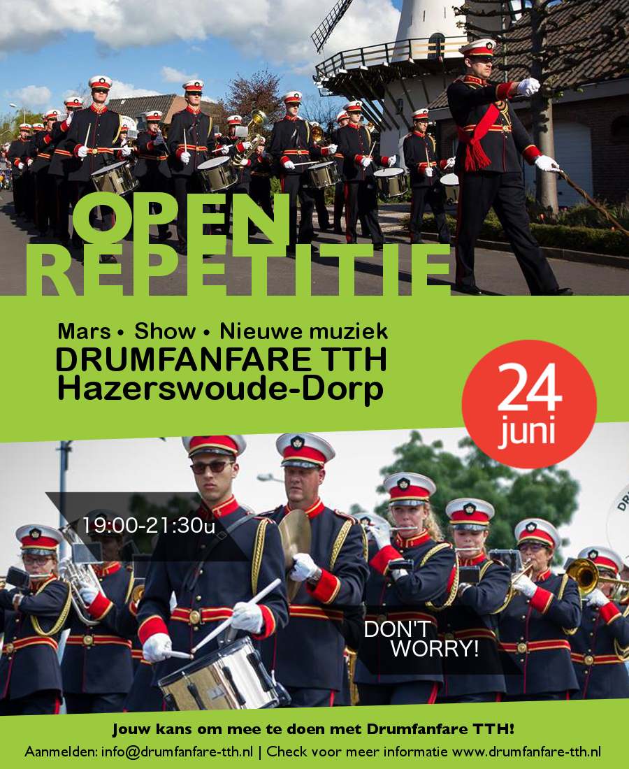 Open repetitie Veelzijdig, enthousiast en ambitieus. Dat is de beste manier om de ongeveer veertig muzikanten van Drumfanfare TTH uit Hazerswoude te beschrijven. Op vrijdagavond 24 juni heb jij de kans om een avondje gezellig mee te repeteren en kennis te maken met de club. Dus bespeel je een instrument? Kom dan zonder verdere verplichtingen naar Hazerswoude voor een leuke muzikale avond.